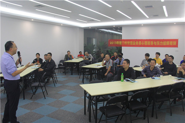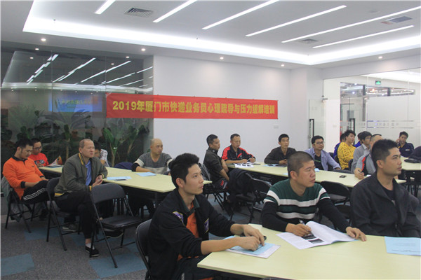 今天,厦门市服务业工会联合会主办,厦门市集美区总工会协办,厦门市快递工会联合会以及厦门市快递行业协会承办,由智晟权教育培训机构就为快递业务员们举办了一场主题为“快递业务员心理疏导与压力缓解”的培训课程,有幸邀请到智晟权教育培训心理咨询高级讲师陈老师在此时为大家送上一碗心灵鸡汤。课堂上,陈老师以幽默、富有活力和亲和力的讲解风格,从压力的来源、正确认识压力、压力缓解方法三大方面逐一分析讲解,同时结合快递业务员们实际工作中遇到的困扰,与学员互动,鼓励学员们主动分享工作压力时的自我感受,大家一起以聊天的方式来释放压力,陈老师还介绍了几种简单易操作的减压方法——快乐工作法、身体操减压法、冥想减压法、颈椎操减压法,再通过理论知识与经典案例相结合,接地气的视频分享以及有趣的心理测验,为大家一一分享实用的减压之法。