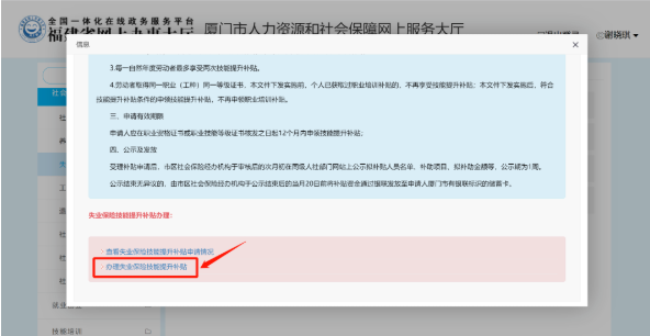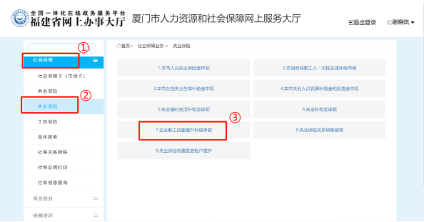 3.点击【社会保障】→【失业保险】→【企业职工技能提升技能补贴申领】;