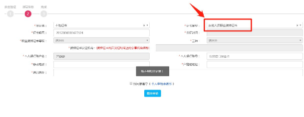 输入:证书编号,系统获取证书相关信息;填写银行账号等其他内容